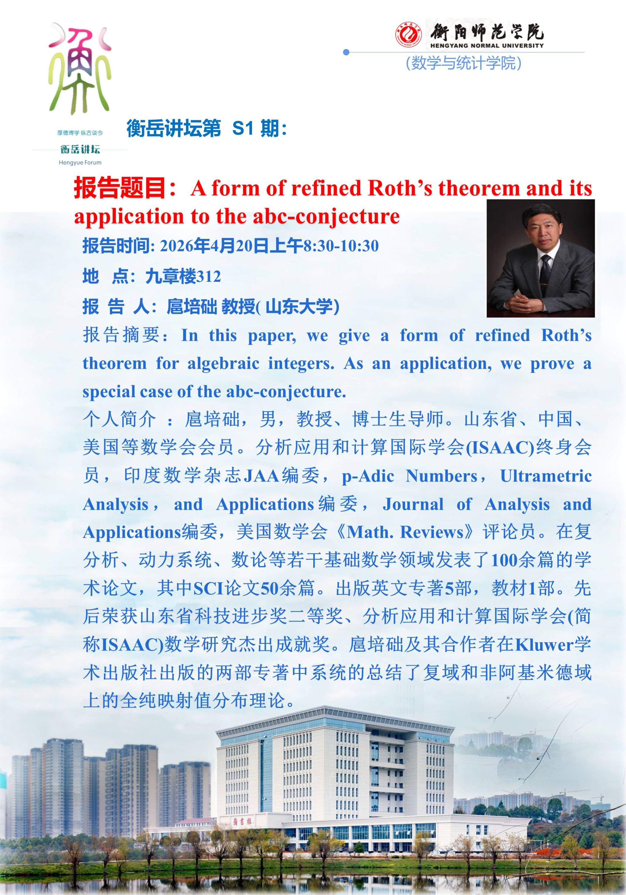 学术讲座预告(2026.04.20)/扈培础:A form of refined Roth’s theorem and its application to the abc-conjecture